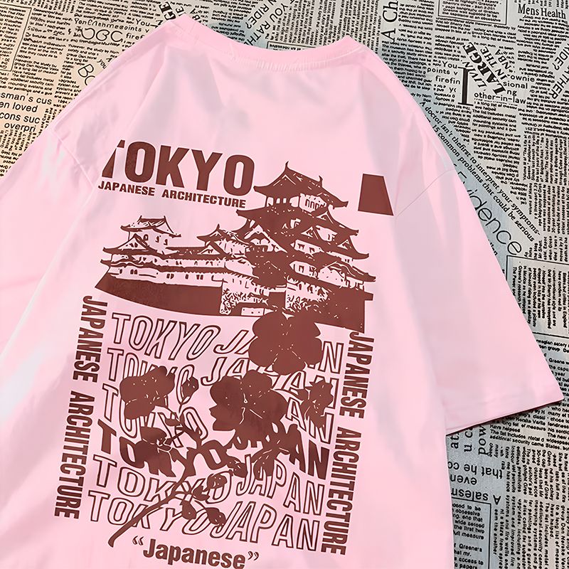 Dieses übergroße T-Shirt bringt Tokio-Flair in die Alltagsmode. Der weiche Baumwollstoff fühlt sich bei warmem Wetter leicht und atmungsaktiv an. Der kühne architektonische Druck fängt den Geist der Tradition und des urbanen Stils ein. Mit seinen weiten Ärmeln und der entspannten Form ist es perfekt für legere Tage oder Lagenlooks.