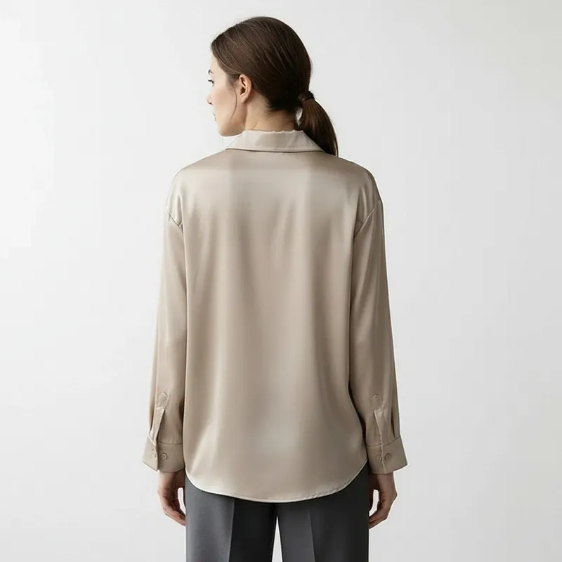 Gefertigt aus weichem, leichtem Material sorgt diese Bluse für eine glatte Textur und ganztägigen Tragekomfort. Die entspannte Silhouette ermöglicht Bewegungsfreiheit und betont dennoch eine schmeichelhafte Form. Vielseitige Styling-Optionen machen sie zum perfekten Begleiter für Röcke, Hosen oder Jeans. Das Hemd verleiht jedem Outfit einen Hauch von Raffinesse und eignet sich sowohl für lässige als auch für berufliche Anlässe. Lange Ärmel und dezente Manschettendetails sorgen für Eleganz und bieten Schutz bei kühlerem Wetter.