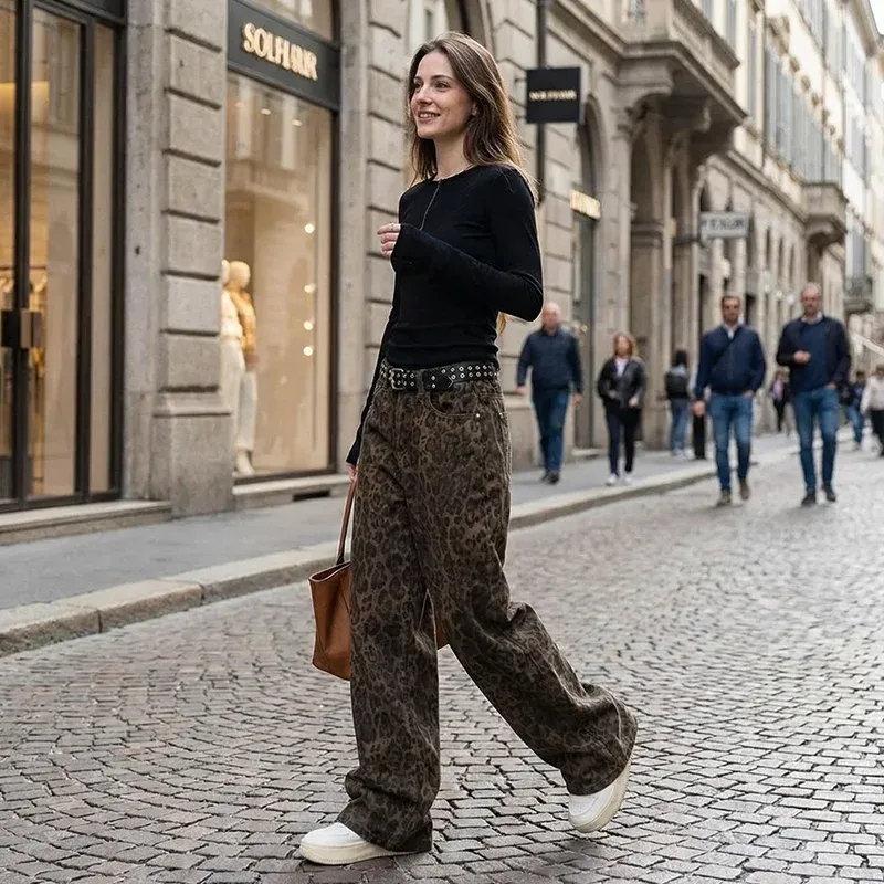 Der auffällige Leopardenprint verleiht Persönlichkeit und ermöglicht es Ihnen, Ihren Stil mühelos auszudrücken. Diese Jeans mit weitem Bein bieten Bewegungsfreiheit und Komfort – ideal für den ganzen Tag. Hochwertiger Denim sorgt für dauerhafte Haltbarkeit und bleibt auch nach mehrmaligem Waschen weich und formstabil. Der hohe Taillenbund betont die natürliche Figur und sorgt für eine schmeichelhafte Silhouette. Die Hose ist perfekt für Brunch, Shopping oder den Abend – viele stilvolle Kombinationsmöglichkeiten inklusive.