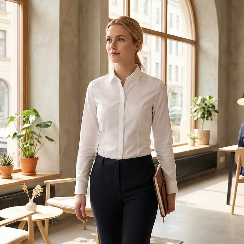Heben Sie Ihren Look mit dieser taillierten weißen Bluse hervor, die eine elegante Silhouette bietet. Der weiche Stoff fühlt sich angenehm auf der Haut an und sorgt für Komfort auch bei längerem Tragen. Das klassische Design lässt sich mühelos mit Röcken, Hosen oder unter einem Blazer kombinieren. Die langen Ärmel bieten angemessene Bedeckung und sind ideal für formelle Büroumgebungen. Strapazierfähige Nähte sorgen für Langlebigkeit und Formstabilität auch bei regelmäßiger Nutzung.